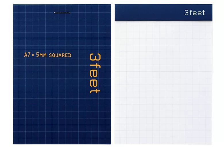 3feet系列速記本以隨身攜帶、方便使用的概念而開發,因此最大的尺寸也只有到A5,以維持其便攜性。速記本內頁已預先裁好裁切線,可以乾淨俐落的撕下。採上掀式翻頁的裝訂,適合單手托著書寫,即使是單手握著也能夠快速翻頁。